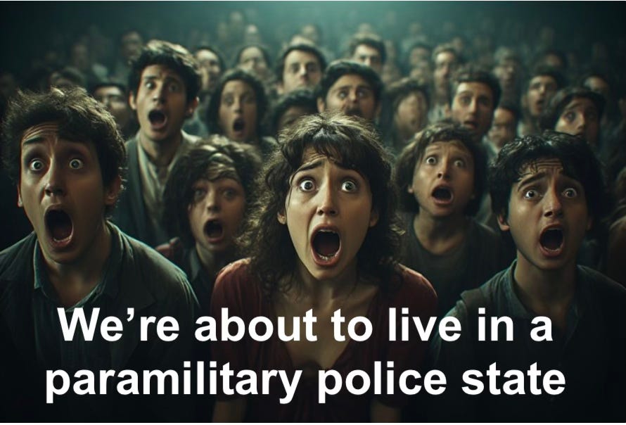 A phrase we should be using instead of Nazi, Gestapo,fascism and others that have become hohum rather than horrifying. We have to alert people that we're about to live in a paramilitary police state.