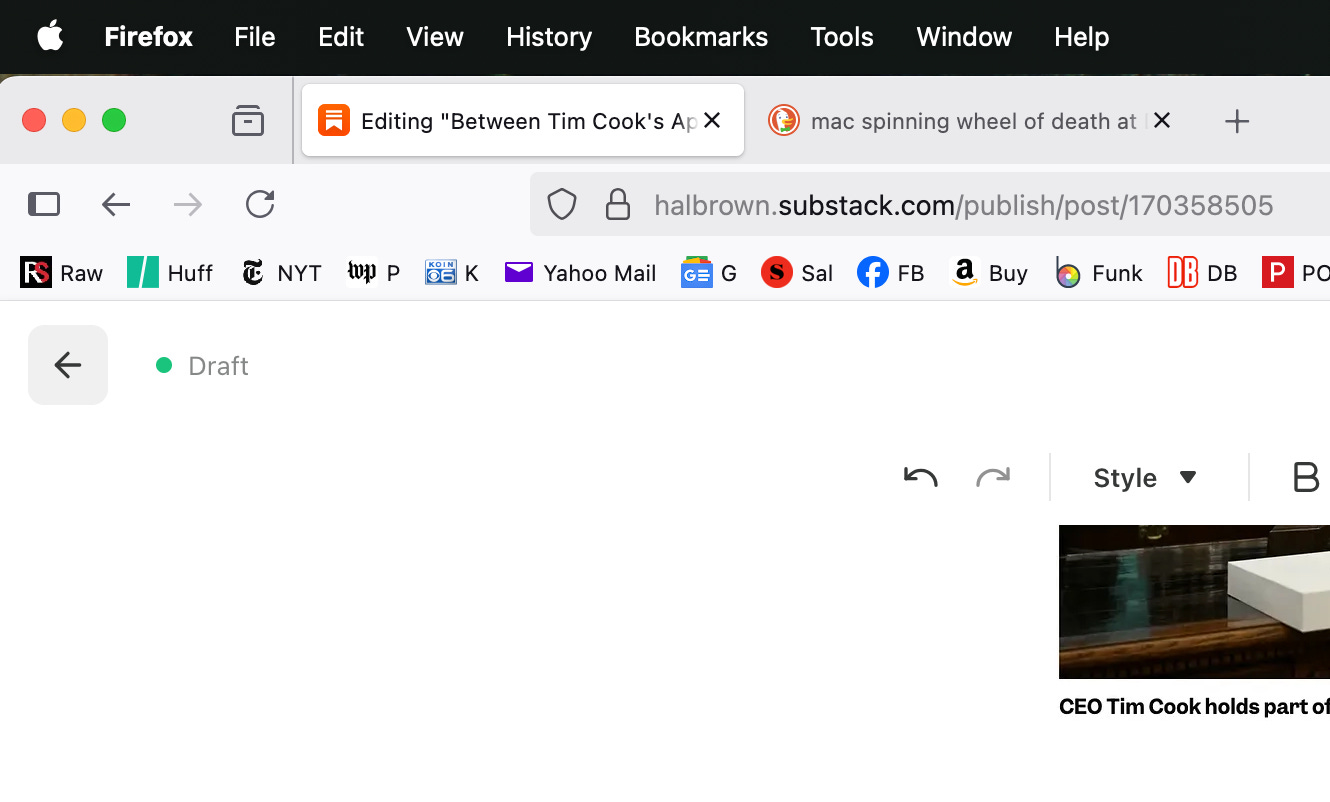 To undo this you have to reboot the laptop and wait for it to reopen. I’ve also been annoyed with how the Apple operating system (OS) Safari is beyond slow when I try to open some web pages. It frequently just stops. When I switch to Firefox the same website opens almost instantly. In fact, for the first time I am composing a Substack from Firefox.