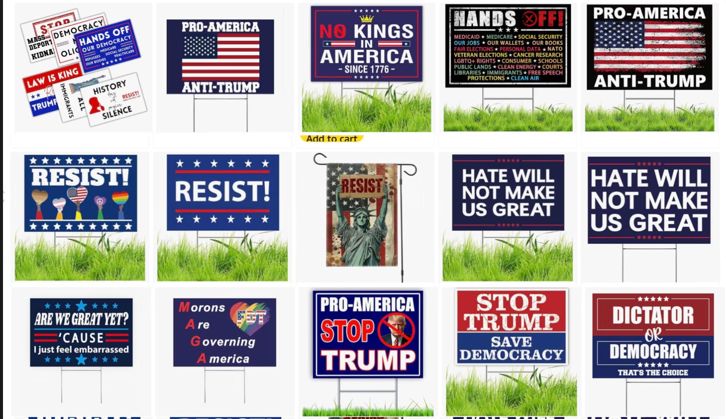 Even though I have negative feelings about Bezos it is noteworthy that while he tired to mess with The Washington Post, which he owns, you are still able to buy a wide assortment of anti-Trump protest signs there (here’s the link). Jusy a few shown below:
