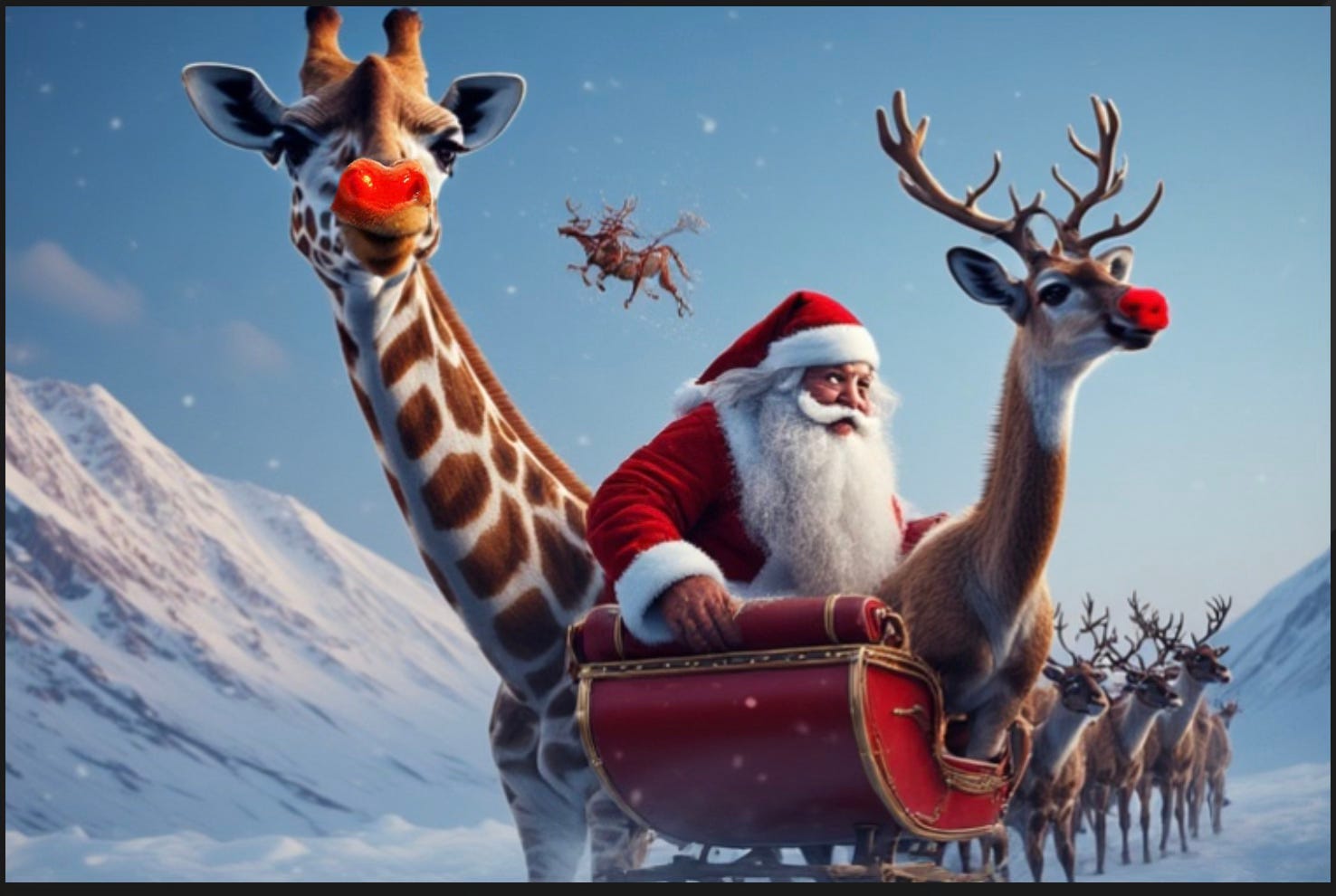 He ended up at the North Pole a few years ago. Chalk it up to climate change how a giraffe ended up at the top of the world. Suffice to say, one, that he did, and two, that like Rudolph he had a bright, glowing, shiny red nose. This might have been the result of frostbite. Like Rudolph was at first, he was shunned by Dasher, Dancer, Prancer, Vixen, and the other high flying Christmas Eve team who, sad to say, were like snobbish oligarchs.