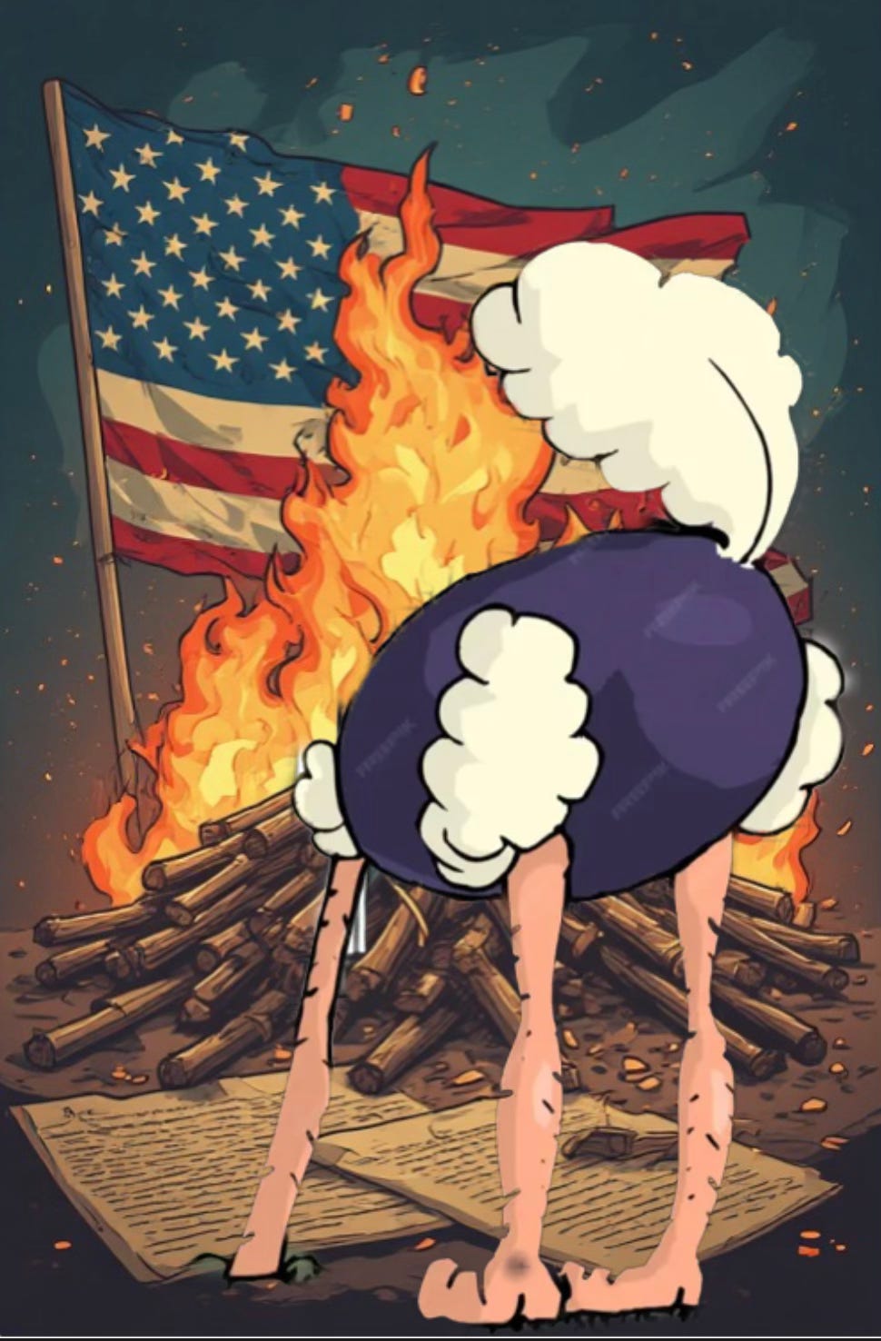 I am not saying everyone who tries to be as optimistic as possible is like the classic ostrich with its head in the sand ignoring the inferno I used AI to depict as the destruction of democracy in my illustration. I am just saying that there are degrees of optimism from wishful thinking which can be close to the primitive psychological defense mechanism denial…