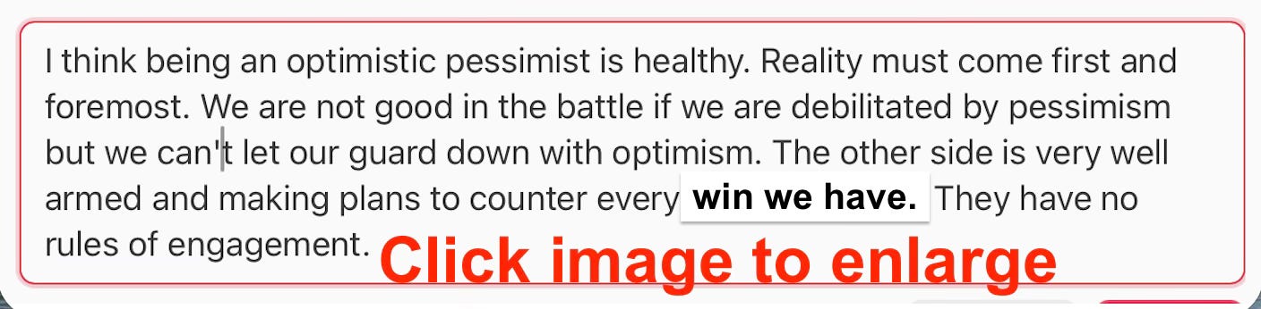 I storngly caution against being afraid to look at dire possibilities and clinging to every win our side has whether in an election, or court, or in the polls, or a disastrous MAGA performance (Pam Bondi’s or Greg Bovino’s for example) without realizing that our enemy is looking at these wins and making plans to counterattack. Our enemy has vast resources and won’t hestitate to violate the Constitution, defy court rulings, and ignore precedent, to win at all cost.