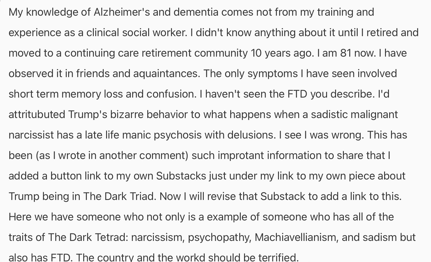 If you are up on your Trump psychopatholgy you not only know what malignant narcissism is, but also know what the Dark Triad is. There have been many articles about Trump and the Dark Triad (here). I’ve written several including, most recently, this one: