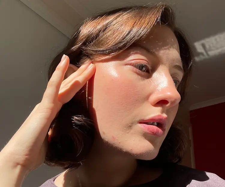 The visible skin near the eyes and hairline reads cooler/pinkish