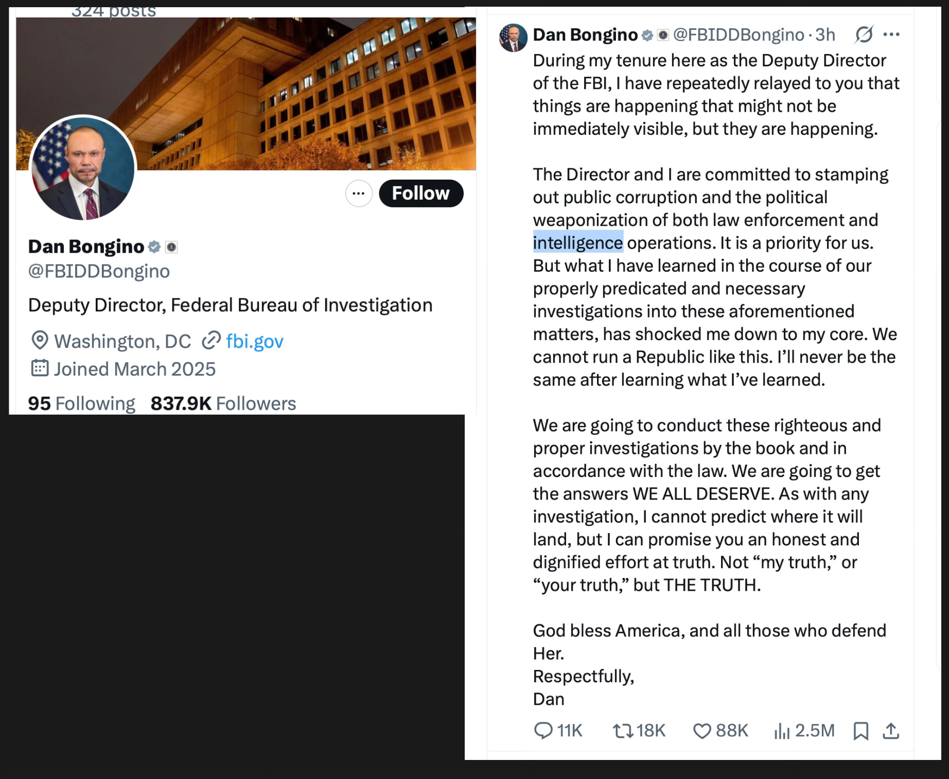 During my tenure here as the Deputy Director of the FBI, I have repeatedly relayed to you that things are happening that might not be immediately visible, but they are happening. The Director and I are committed to stamping out public corruption and the political weaponization of both law enforcement and intelligence operations. It is a priority for us. But what I have learned in the course of our properly predicated and necessary investigations into these aforementioned matters, has shocked me down to my core. We cannot run a Republic like this. I’ll never be the same after learning what I’ve learned. We are going to conduct these righteous and proper investigations by the book and in accordance with the law. We are going to get the answers WE ALL DESERVE. As with any investigation, I cannot predict where it will land, but I can promise you an honest and dignified effort at truth. Not “my truth,” or “your truth,” but THE TRUTH. God bless America, and all those who defend Her. Respectfully, Dan